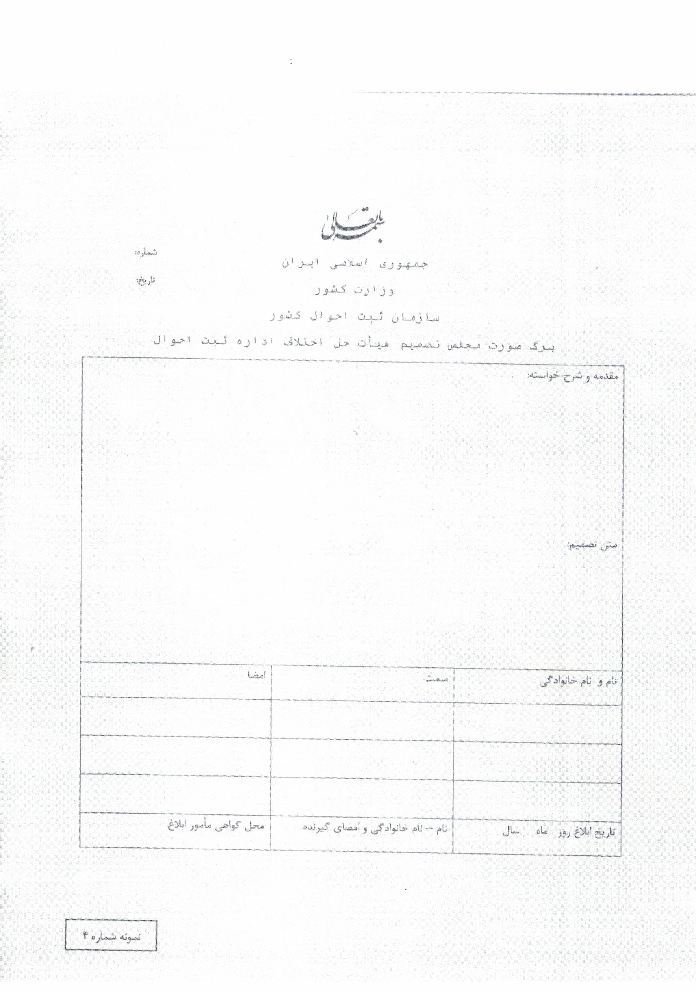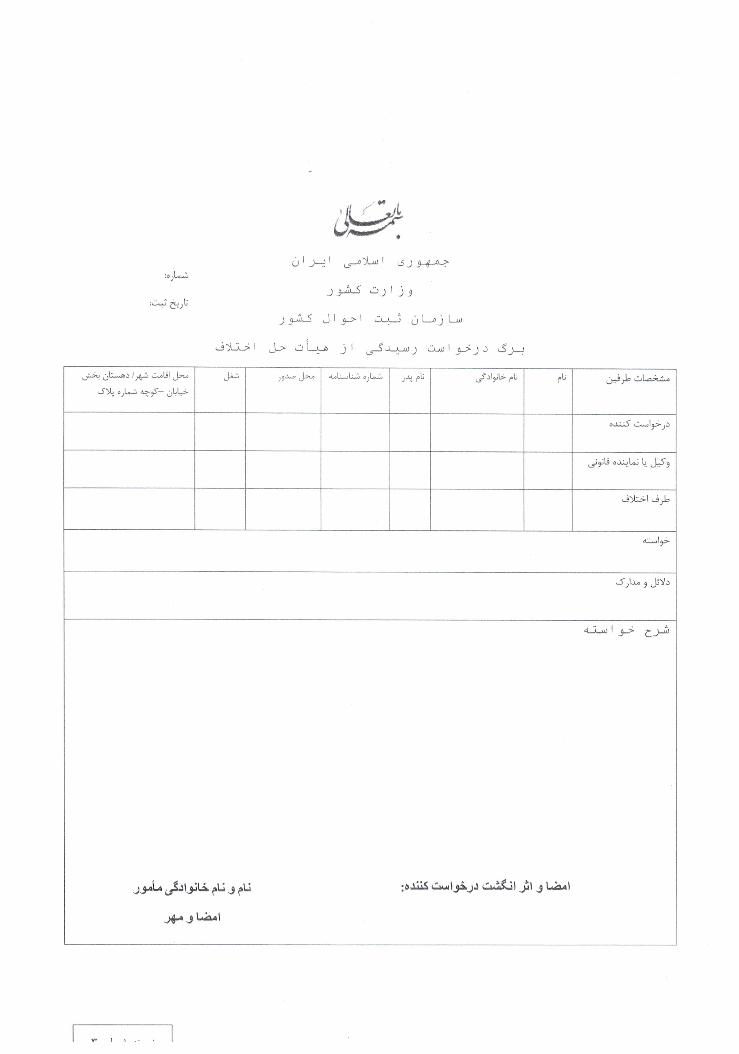 ** توجه : درخواست رسیدگی از هیات حل اختلاف در سازمان ثبت احوال داخل کشور (حوزه محل صدور شناسنامه) انجام میشود و به طور متوسط بین 3 تا 6 ماه بطول می انجامد.